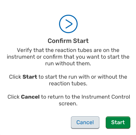 | 8. | (Optional) If no reaction tubes are detected on the instrument, click either Start in the Confirm Start modal to start the run without reaction tubes or Cancel to cancel the run. |