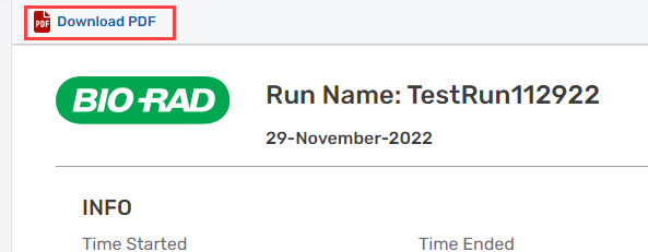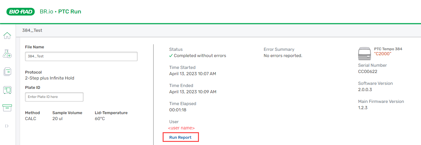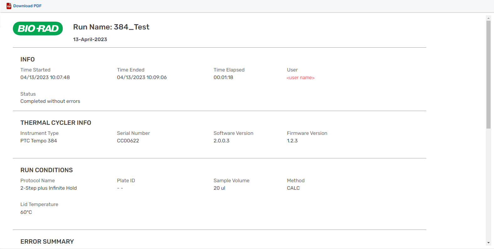 Run Details — Temperature and timestamp for each protocol step and repeat, along with run completion timestamp |